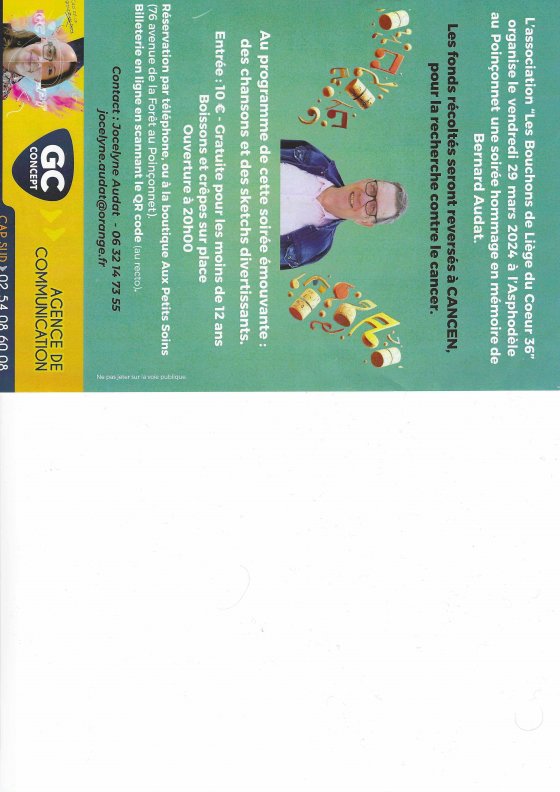 L’association Les Bouchons de liège du cœur 36 organise, samedi 29 mars 2023, à partir de 20 h 30, une soirée musicale à l’Asphodèle du Poinçonnet dont les bénéfices seront reversés à l’association Cancen qui est basée à l’hôpital Bretonneau à Tours. Cette dernière aide les malades par la recherche de nouveaux médicaments et matériels innovants pour soigner le cancer. Elle propose aussi un accompagnement thérapeutique pour soulager les malades.