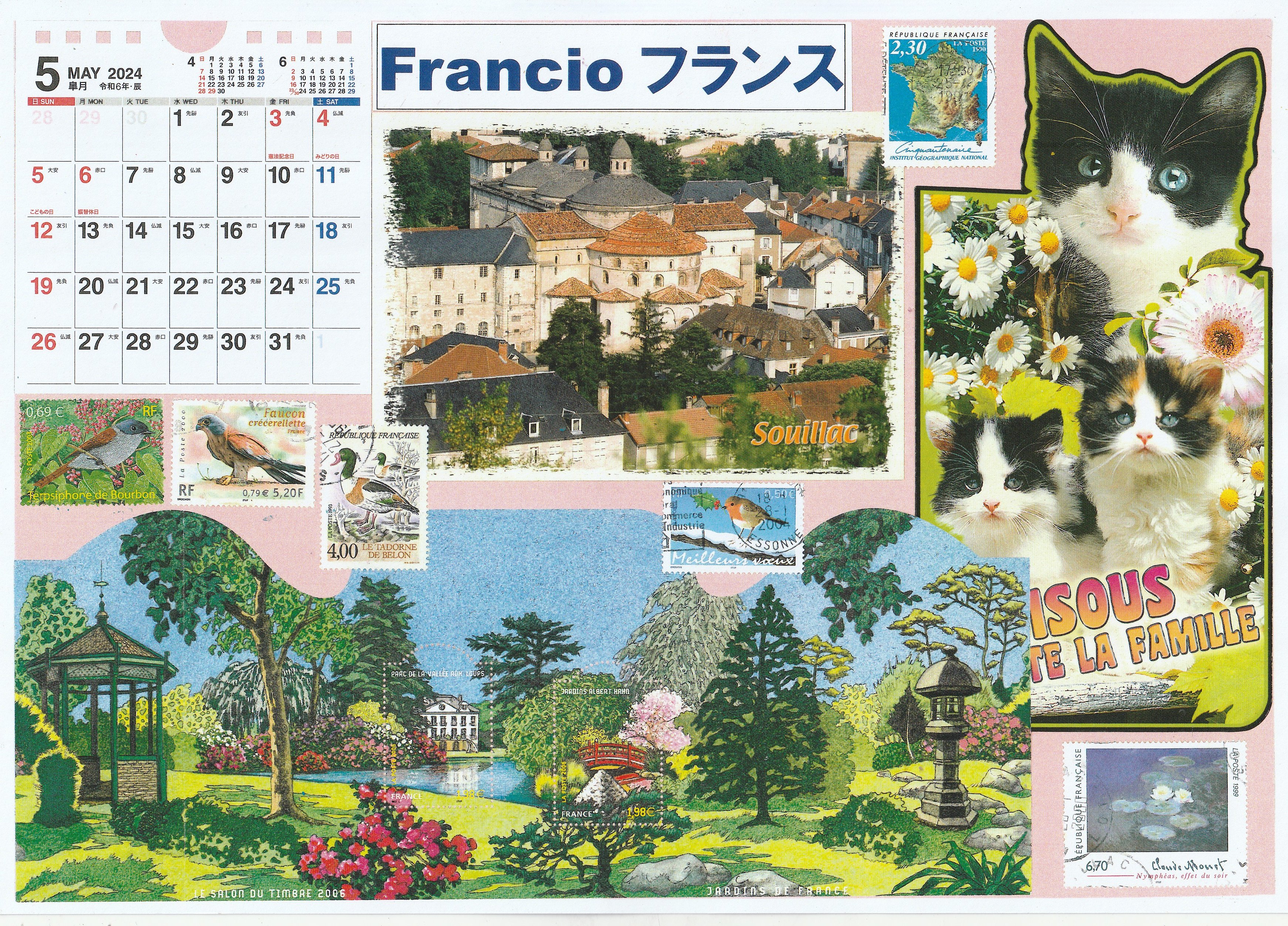 Kalendaro, kiun mi faris el posxtkartoj kaj posxtmarkoj. Majo temas pri Francio. La posxtkarto sur la kalendaro temas pri la urbo Souillac, kie mia kara amiko Paul logxis, kaj mi fojfoje vizitis lin, sed li jam forpasis. Ni kune plantis sakura-arbon en lia gxardeno. Kiel gxi estas nun ? Mi tre amis lin kaj mi tre amis lian gxardenon. Nun eble neniu logxas en lia domo, do cxio en lia domo restas sentusxe, inkludante miajn malnovajn kalendarojn.